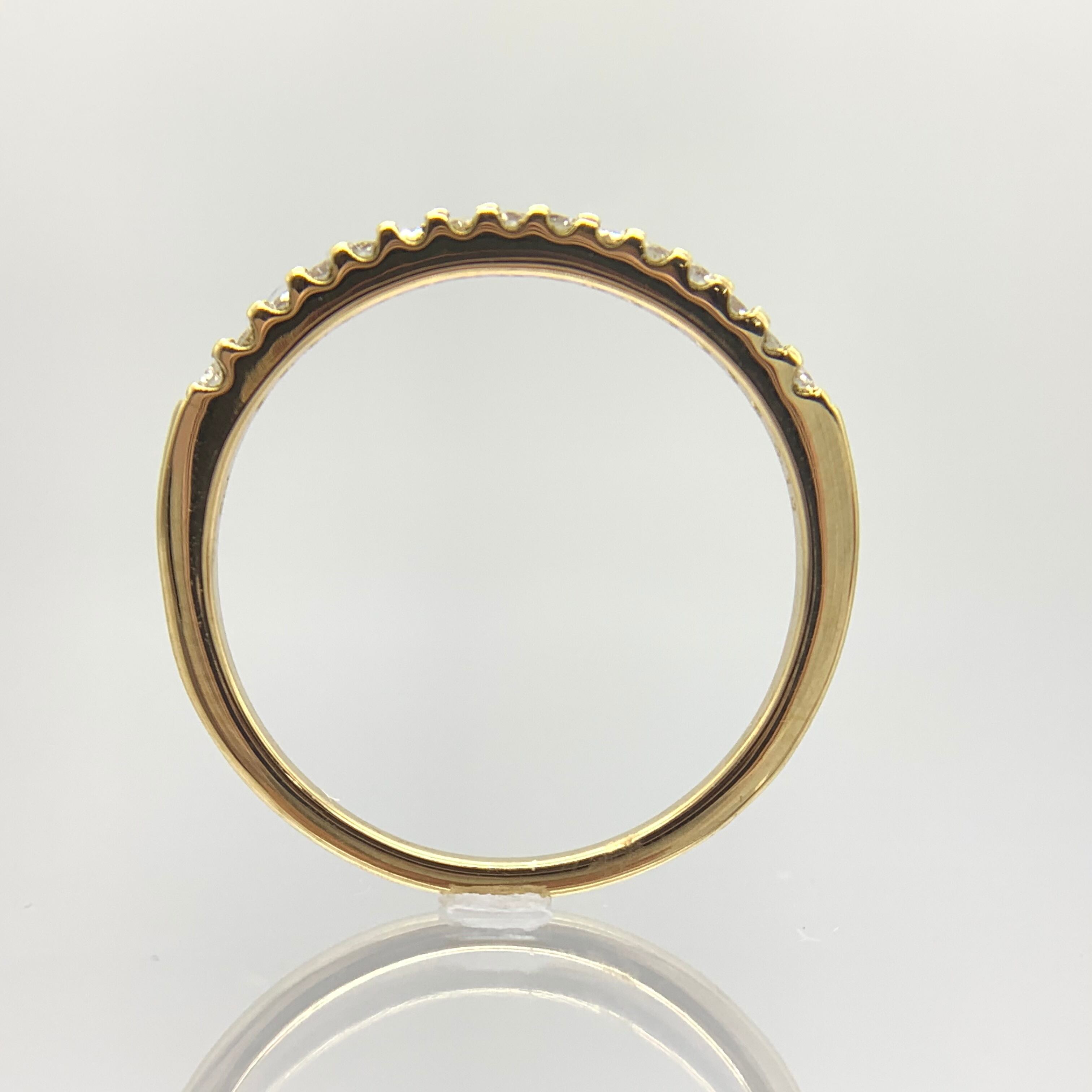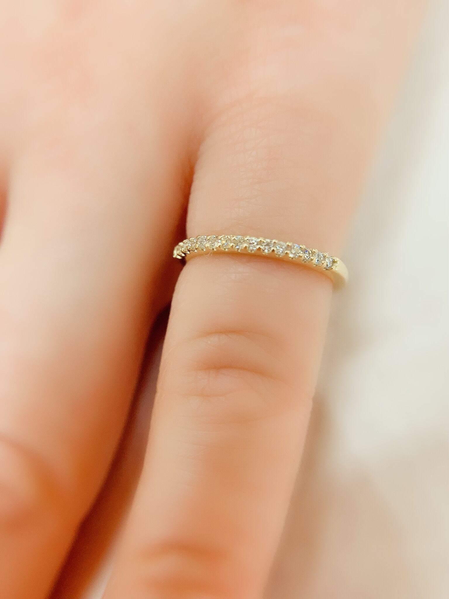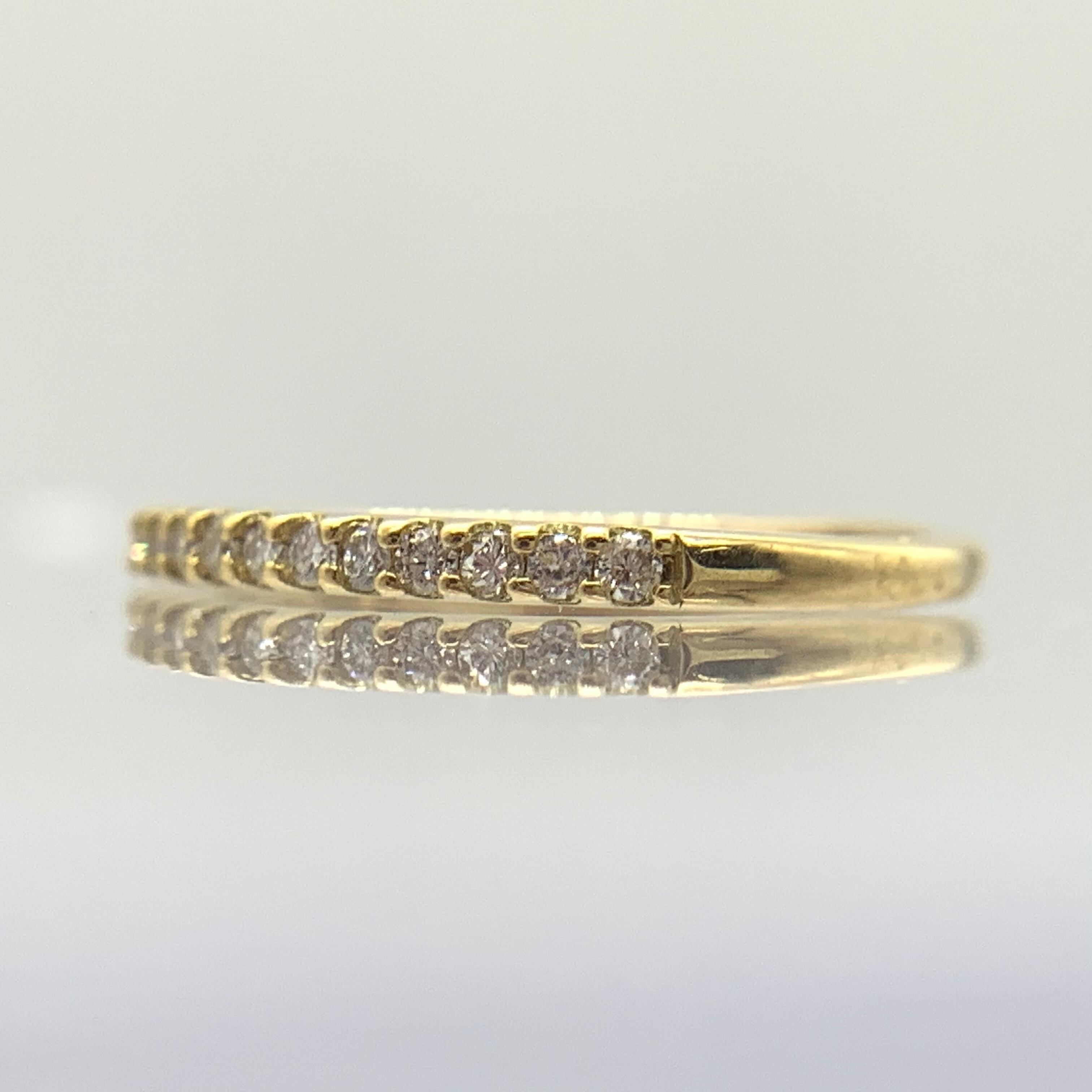 半周にダイヤモンドをセッティングした、シンプルな爪留めタイプのハーフエタニティピンキーリングは、繊細な女性らしいイメージ。