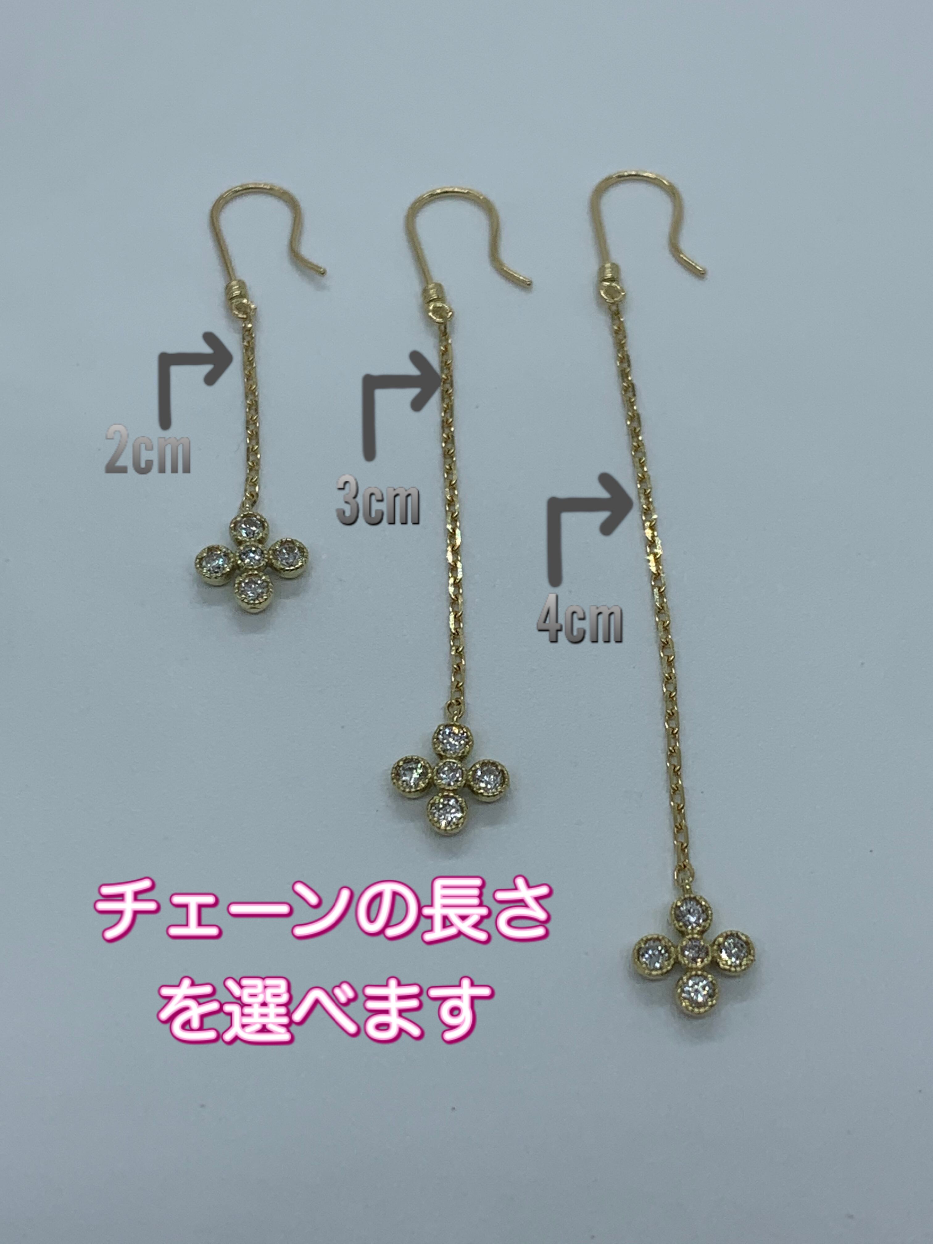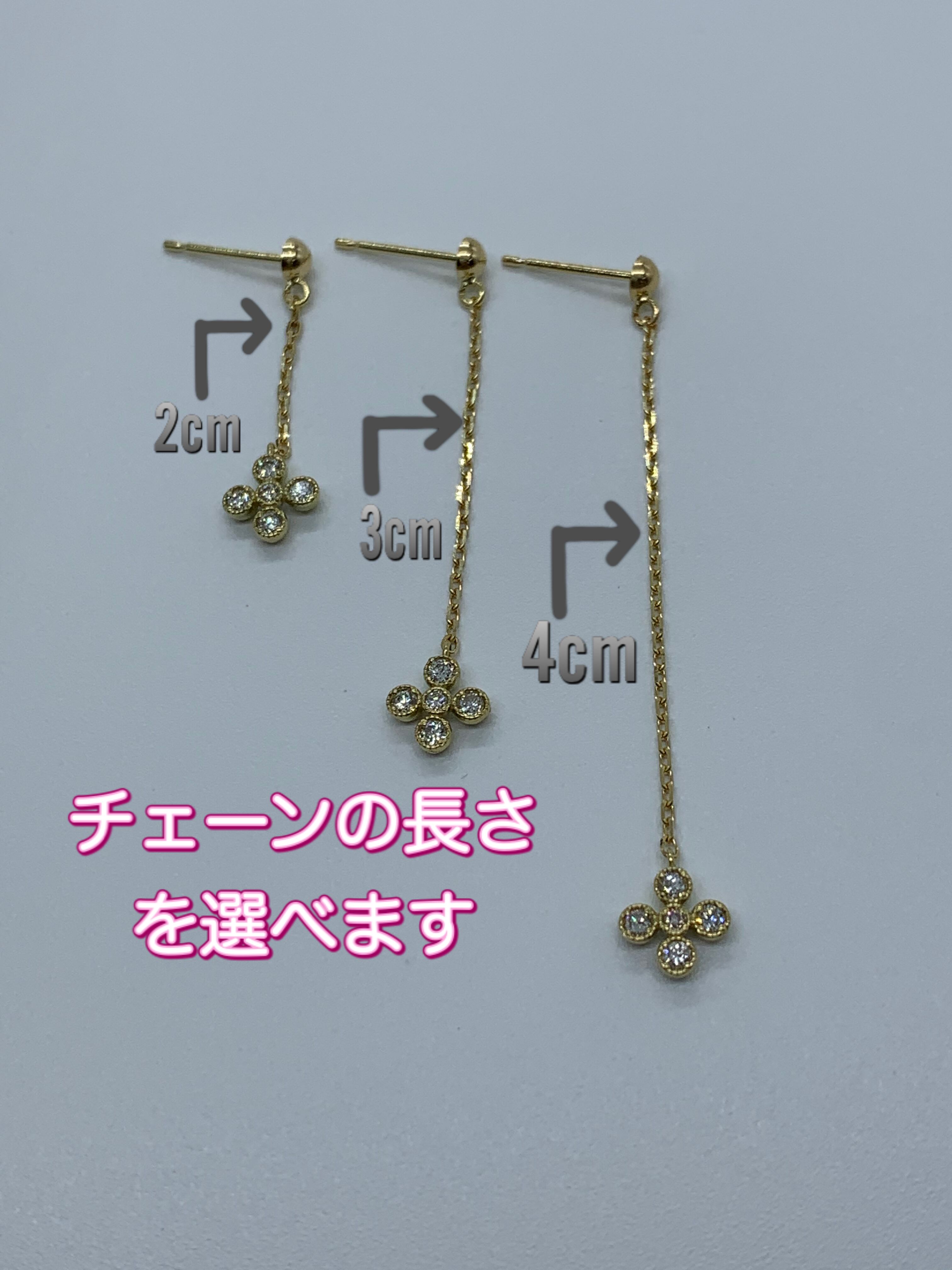 ピアス金具も基本アメリカン.半球ブラ.スクランブルと3種類から選べます。又チェーンの長さも基本2㎝.3㎝.4㎝と3種類からお選び出来ます。