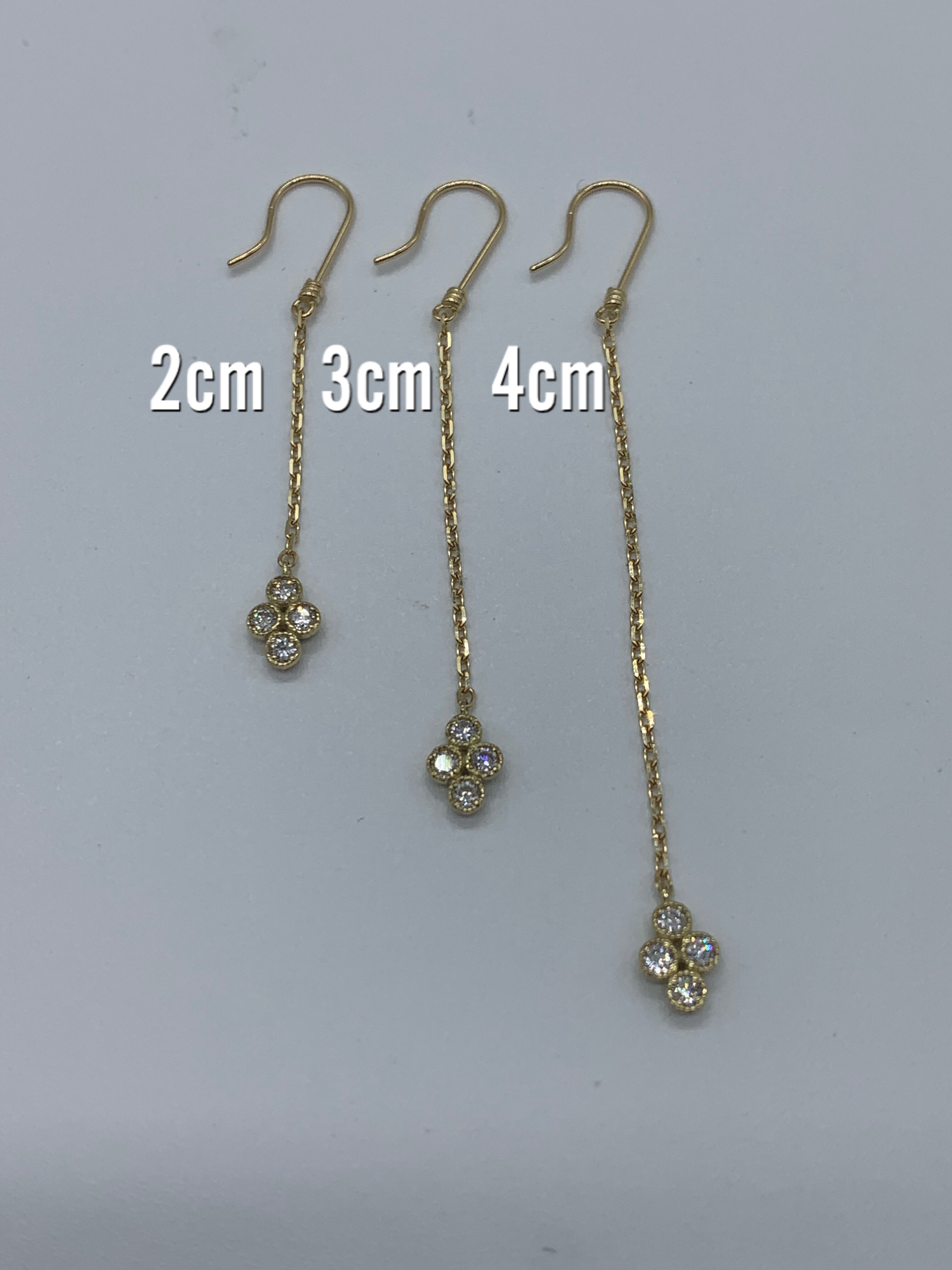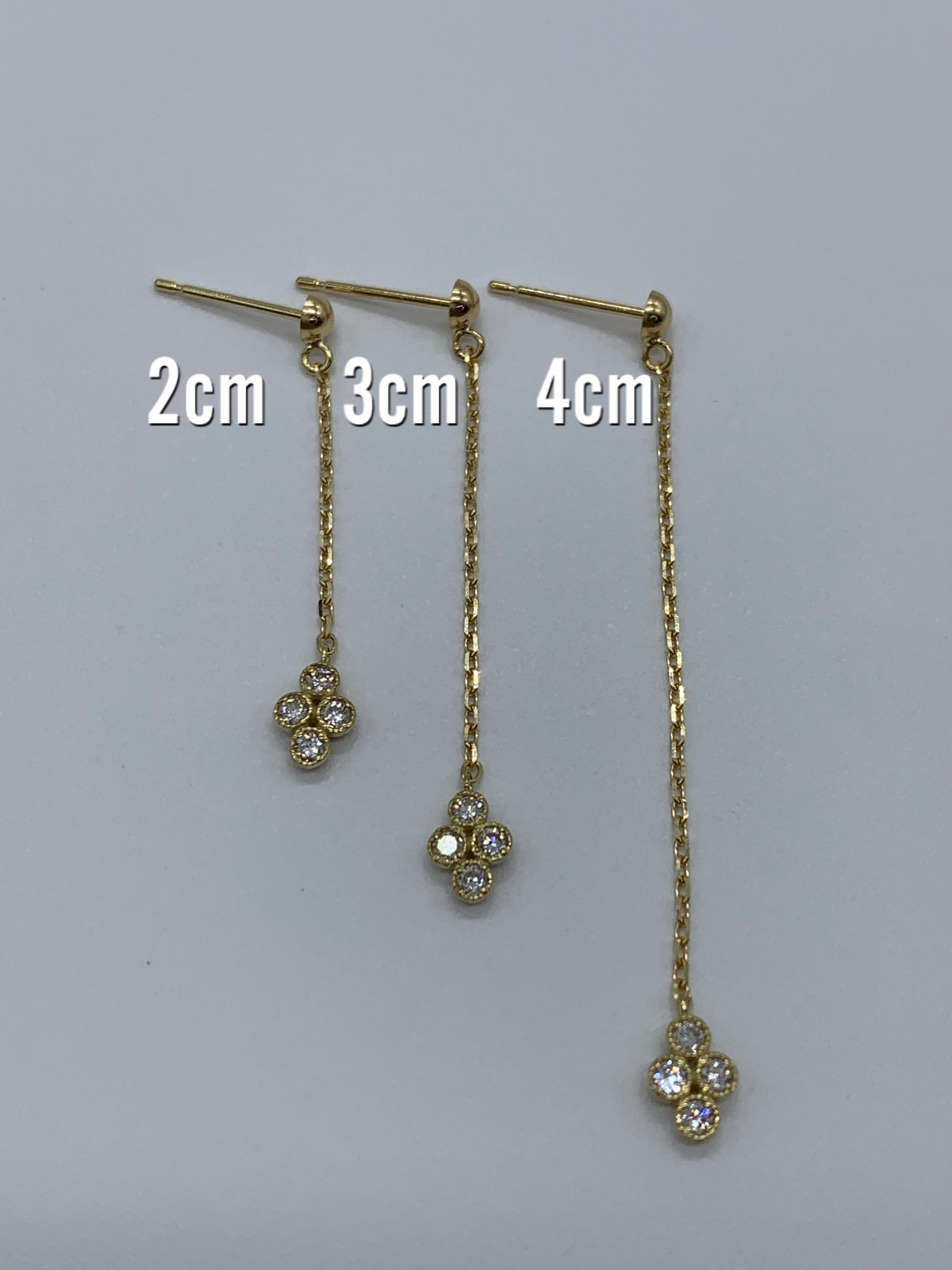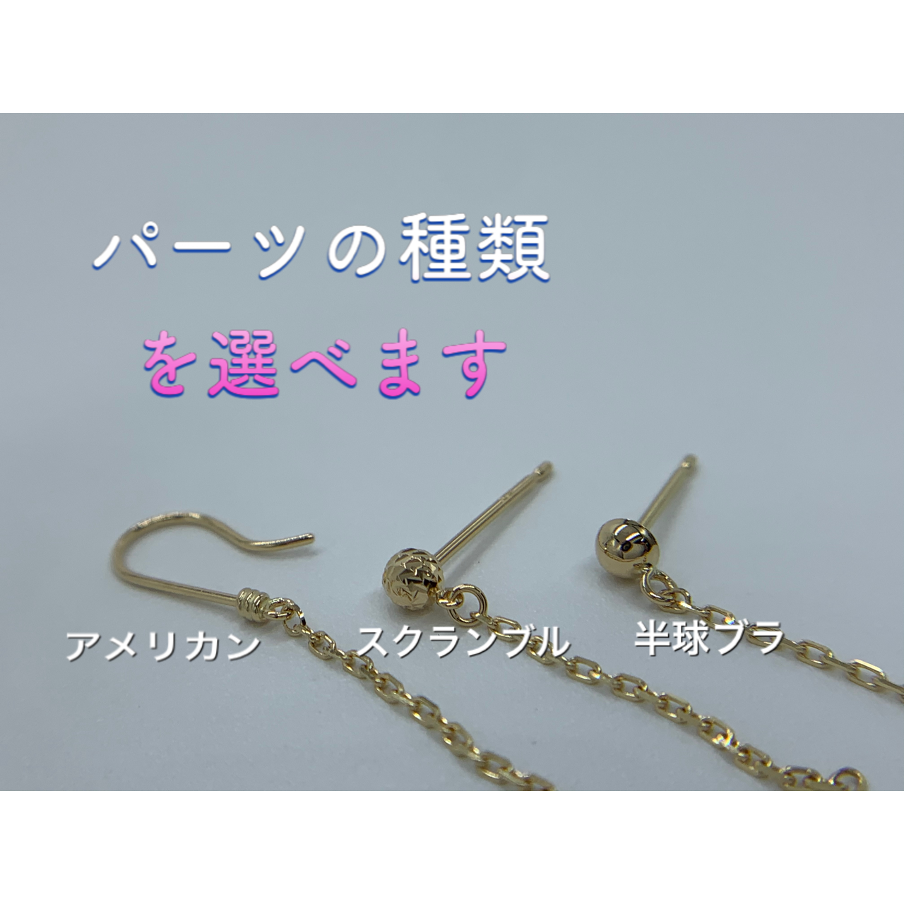 ピアス金具も基本アメリカン.半球ブラ.スクランブルと3種類から選べます。又チェーンの長さも基本2㎝.3㎝.4㎝と3種類からお選び出来ます。